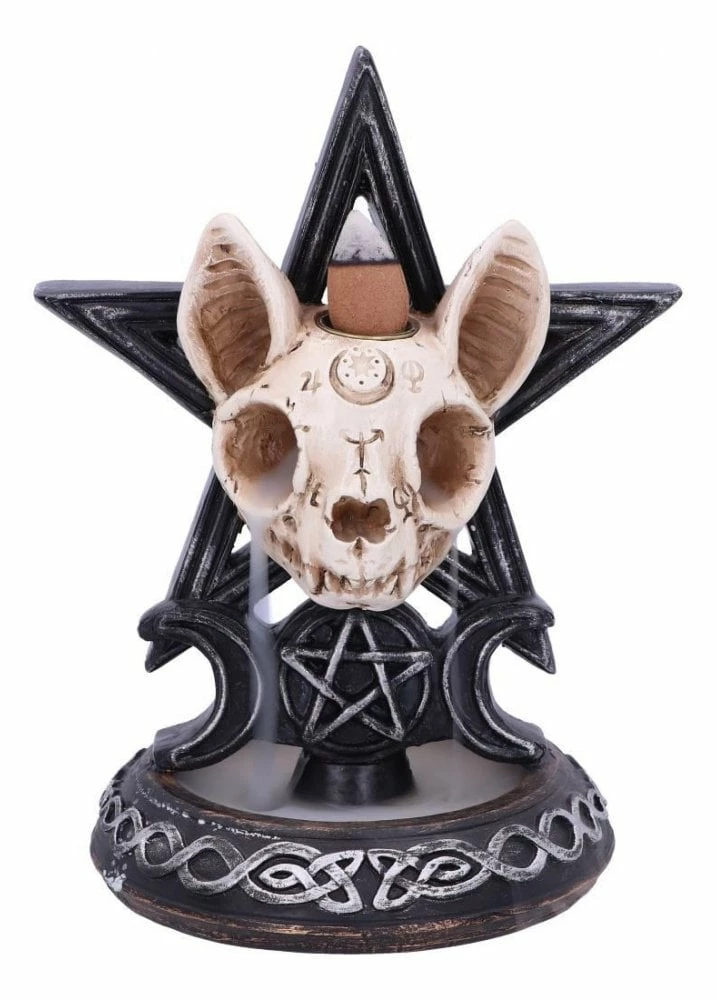 The Familiar Worship Backflow Incense Burner from Nemesis Now creates a dramatic smoke effect. The cat skull sits on a pentagram engraved with Wicca symbols and is cast from high quality resin and expertly hand painted.