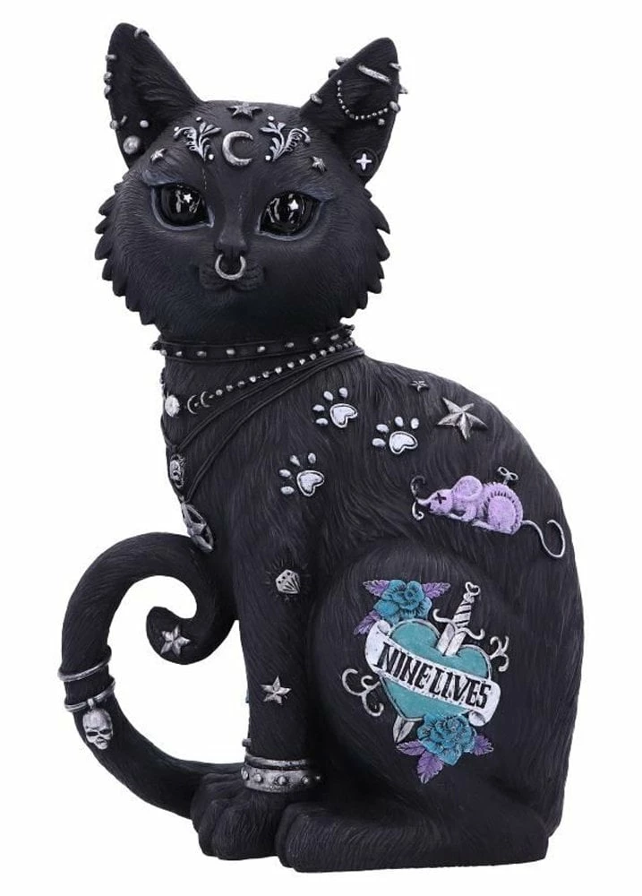 The Nine Lives Cat Figurine from Nemesis is a bewitching feline figure. This kitty figurine has handpainted tattoos and a nose ring.