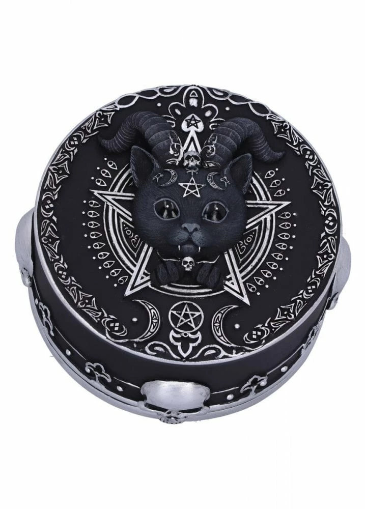 The Pawzuph Trinket Box from Nemesis Now is a cute little box with lid. The gothic box has a 3D horned cat design and silver painted symbolic symbology.