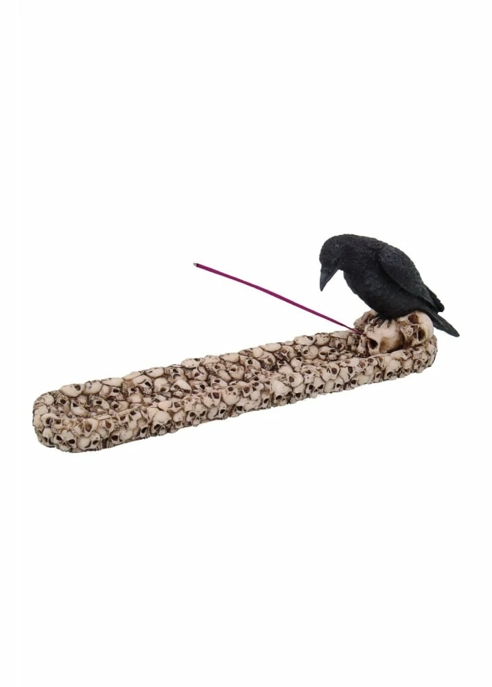 The Raven Skull Incense Holder from Nemesis Now is a gothic decorative accessory for your home. A raven perches on top of a pile of skulls, allowing you to place an incense stick before it.