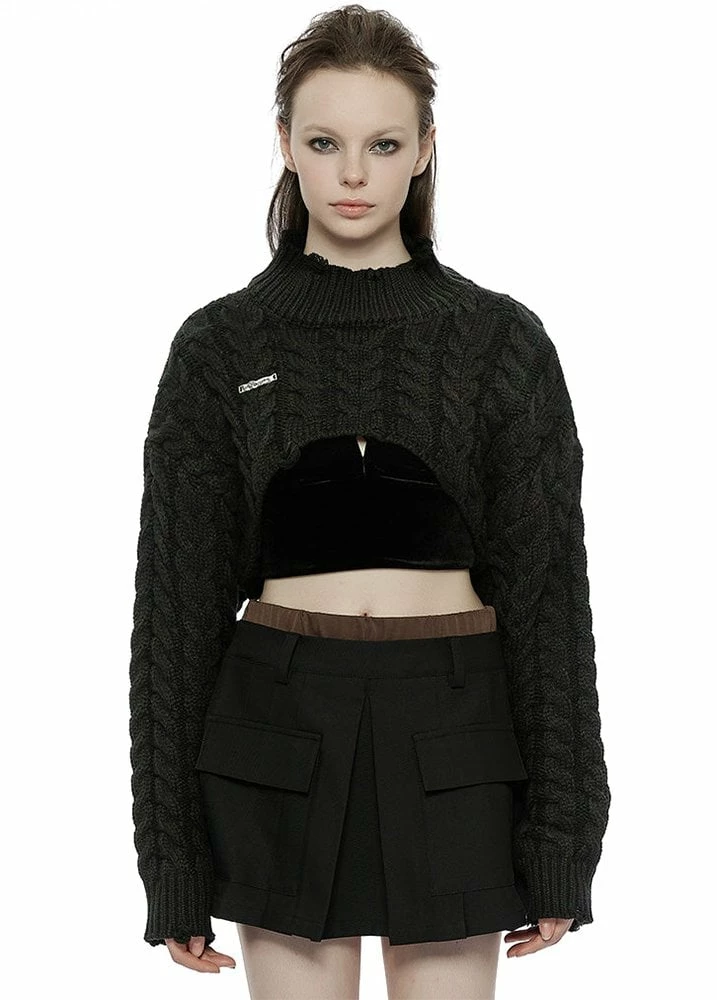The Cable Cropped Sweater from Punk Rave is a cable knit jumper. The jumper has a high neck and high cropped front.