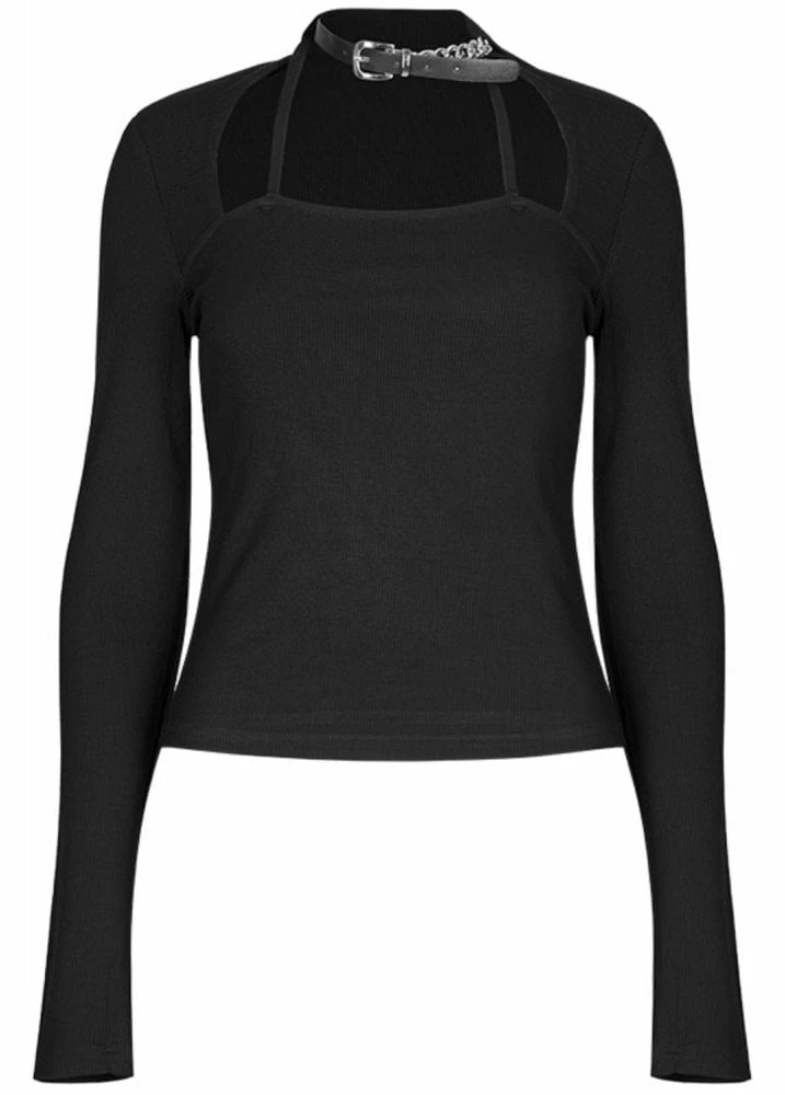 The Chained 2 Me Choker Top from Punk Rave is a black long sleeved top with faux bolero shoulders and sleeves. The gothic top has a buckle and chain fastening choker neckline.