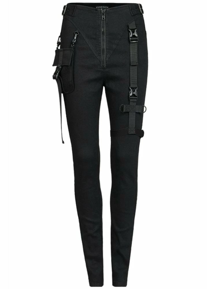 Punk Rave’s Diablo Skinny Pants are are pair of skinny fit trousers with long zip front. The gothic pants have multiple straps and a detachable mesh pocket on the side.