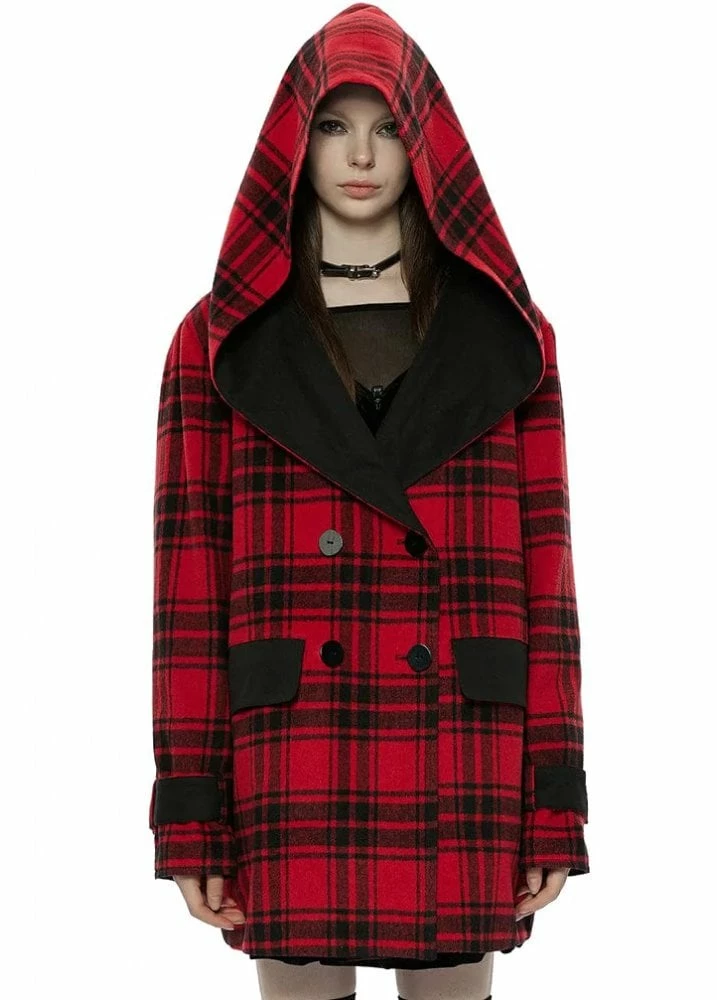 The Grunge Reversible Plaid Coat from Punk Rave is a gorgeous checked coat with oversized hood. The coat has a double breasted button front, pockets and can been worn inside out with black on the reverse.