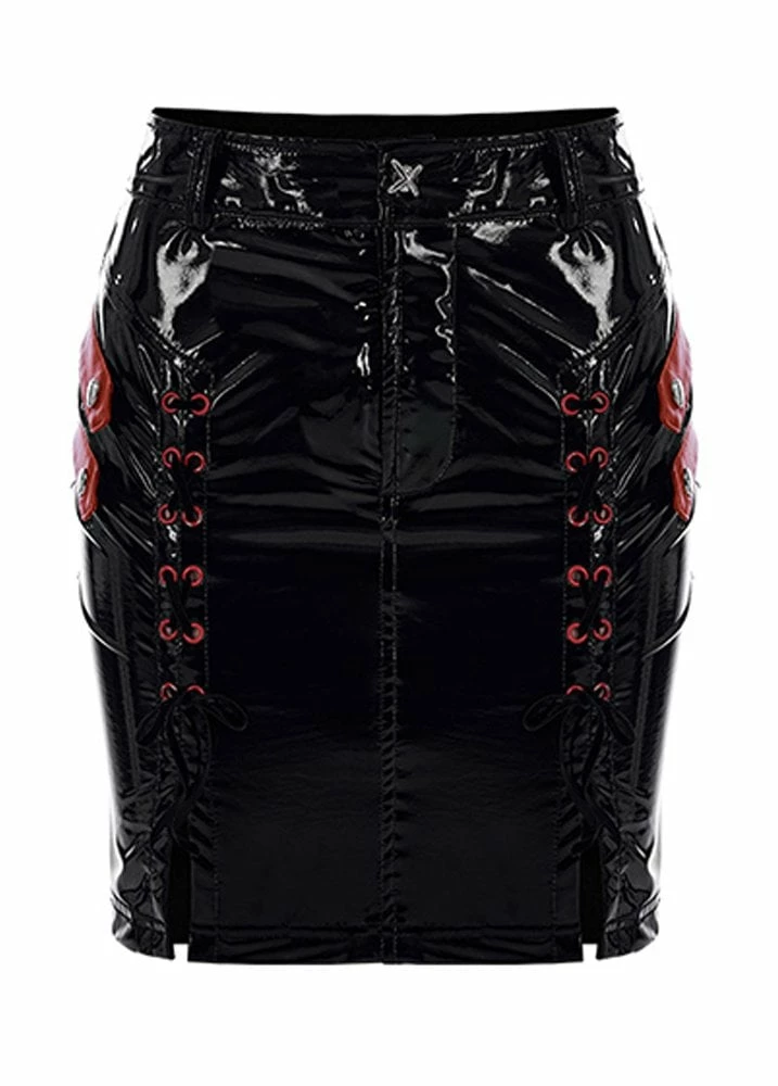 The Manson Gloss PVC Lace-Up Mini Skirt from Punk Rave is a bodycon mini skirt. In black gloss PVC, the skirt has a button and zip front and red lacing and straps.