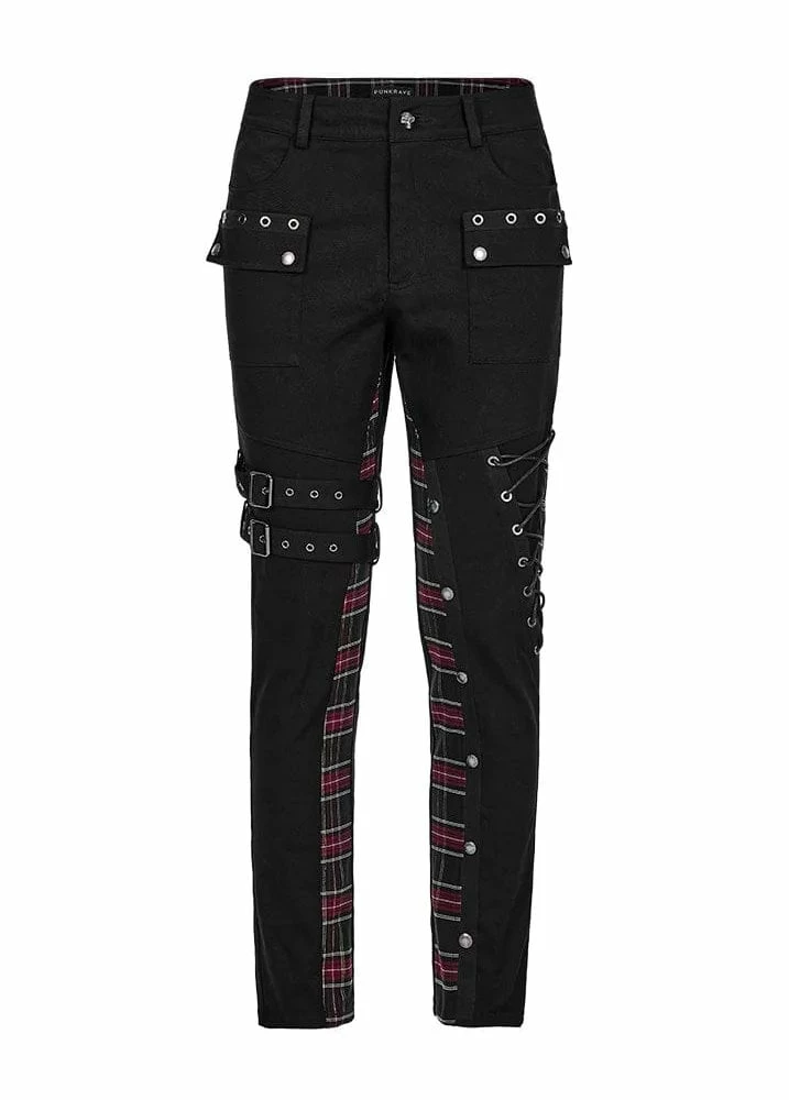 Punk Rave’s Metallic Spliced Plaid Bondage Pants are a pair of punk straight leg trousers. The black pants have tartan panels with lacing down one leg, buckle straps and studs.
