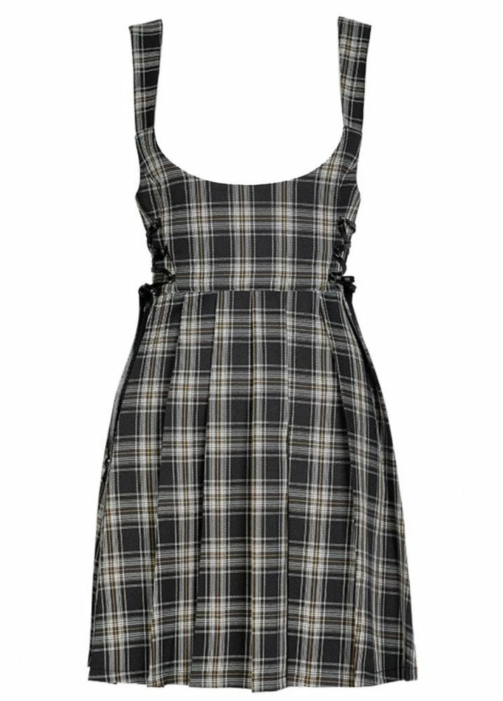 Punk Rave’s Molly Checked Pinafore Dress is a black and yellow checked dress. The pinafore dress has a low scooped neckline, lace up sides and pleated skirt.
