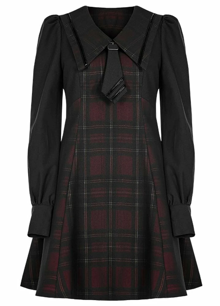 The Plaid Sailor Collar Dress from Punk Rave is a dark red and black tartan dress. The long sleeved dress has a sailor collar, fitted cuffs and removable tie.