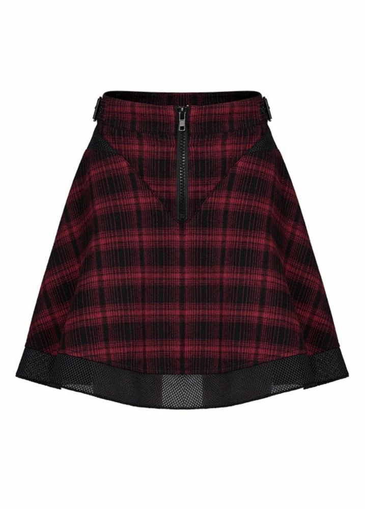Punk Rave’s Rebel Checked Skirt is a red and black checked skirt with zip front. This cute little mini skirt features a black mesh trim.
