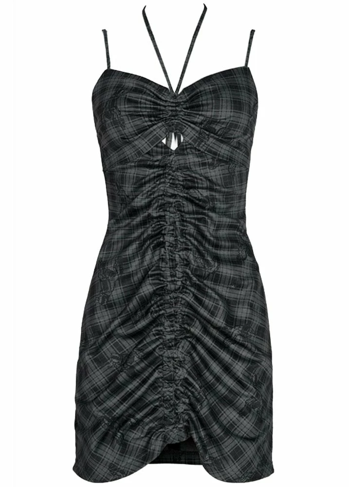 Punk Rave’s Ruched To Thrill Dress is a grey and black checked dress with flocked angels. The dress has adjustable straps with a halterneck tie and ruched front and bust.