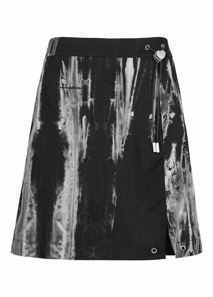 Punk Rave’s Spray Paint Skirt is a black skirt with white paint effect print. The alternative mini skirt has a side drawstring at the waist with heart pull.