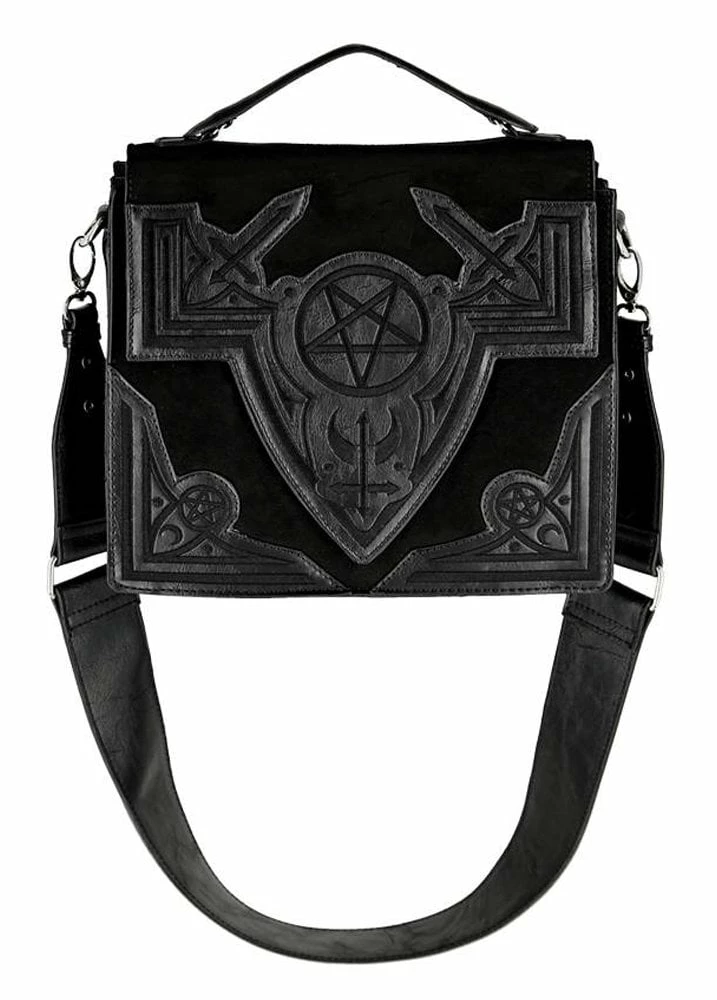 The Amaris Bag from Restyle is a faux leather handbag. The gothic bag has embroidered symbols on the front with a split internal compartment and wide adjustable shoulder strap.