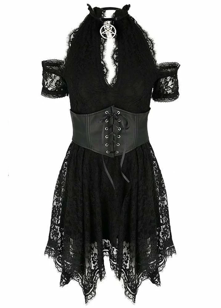 Restyle’s Asymmetric Lace Corset Dress is a little gothic mini dress with black lace overlay. The dress has a high neckline with a pentagram charm, asymmetric hem and faux leather corset waist with lacing.