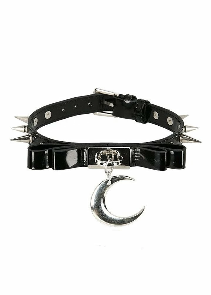 The Bow Moon Collar is a black vinyl buckle fastening choker. The gothic choke has a bow front with metal spike studs and crescent moon charm.