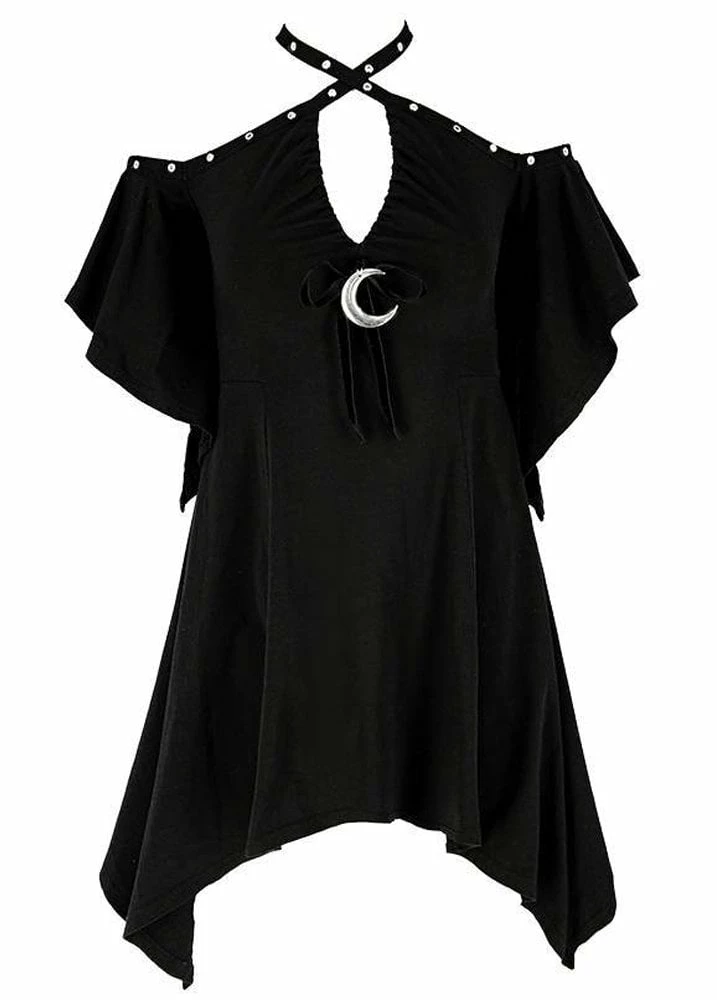 Restyle’s Calista Tunic is a witchy tunic dress with butterfly sleeves and cold shoulders. The gothic dress has halterneck cross straps with studs and a crescent moon charm.