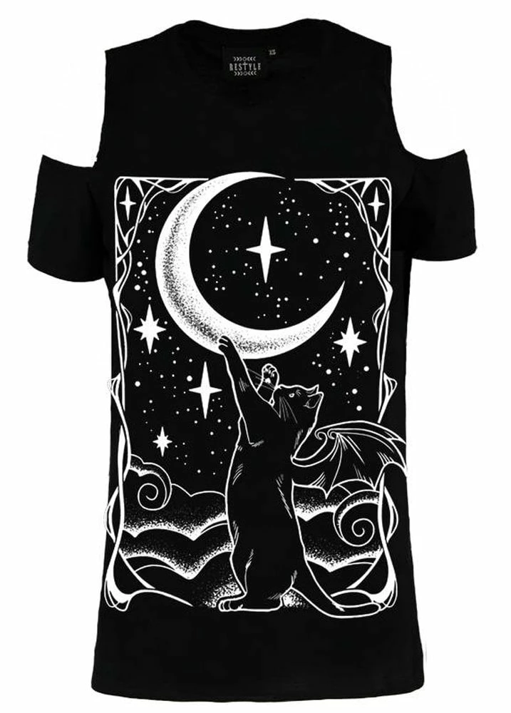 Restyle’s Cat Crescent Cold Shoulder T-Shirt is a comfy cotton fitted tee. The cold shoulder top features a a bewitching kitty and crescent moon print.