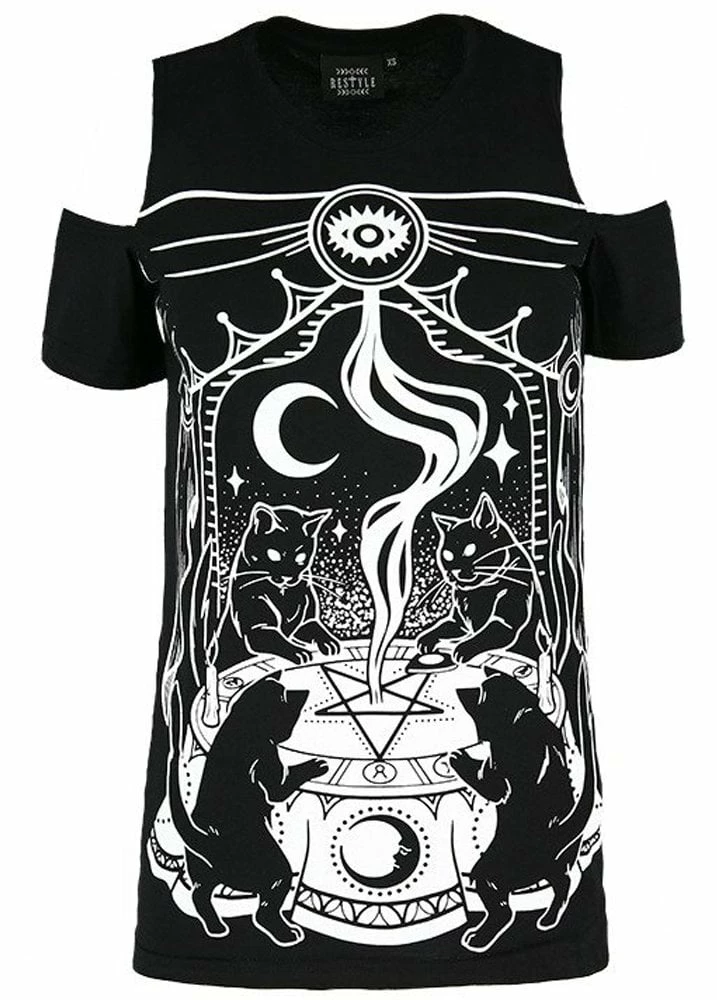Restyle’s Cat Sabbath Cold Shoulder Top is a comfy cotton tee with cold shoulders. The top features a print of cats gathered around a ouija board.