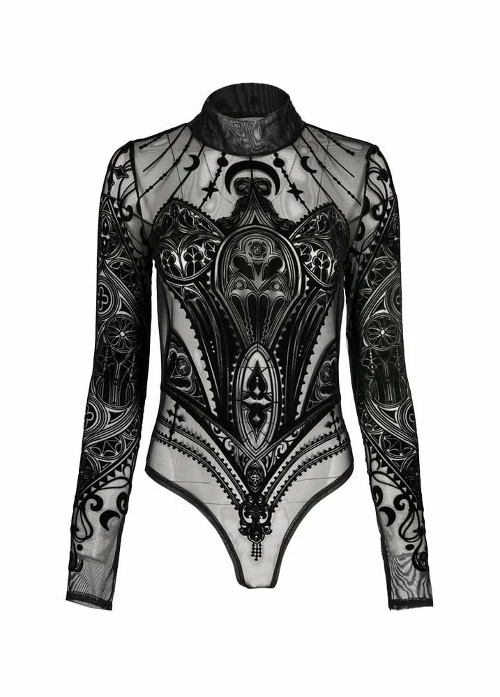 Gothic long sleeve playsuit made of 100% sheer mesh.