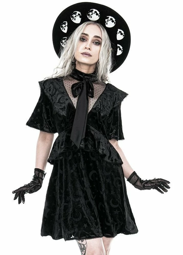 Restyle’s Devoured Dress is a bell sleeved mini dress. The gothic velvet dress has a crescent moon and stars laser-burn design, a polka dot mesh neckline insert, ribbon necktie and ruffles.