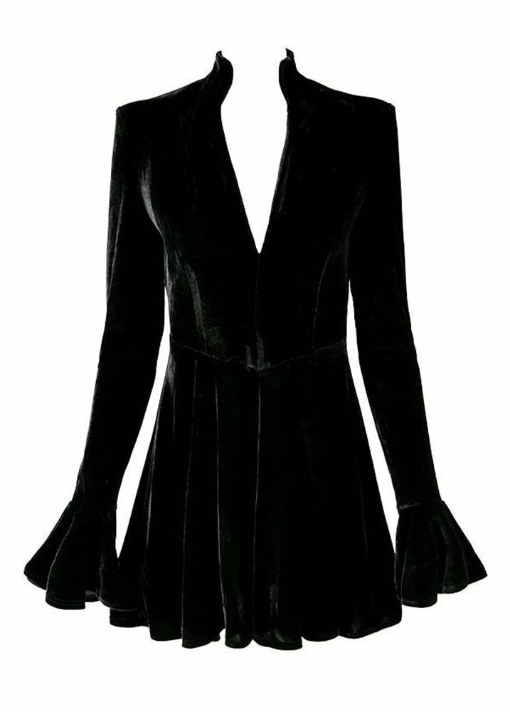 Restyle’s Draculina Gothic Dress is a Morticia-inspired velvet dress. The gothic dress has a plunging neckline and long sleeves with frilled cuffs.