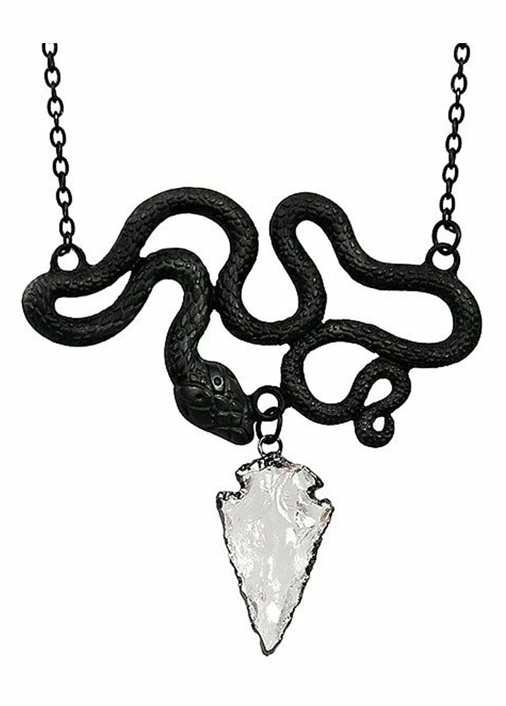 The Entwine Necklace from Restyle features a slithering serpent. The gothic necklace with snake pendant also has a clear quartz pendant at the bottom.