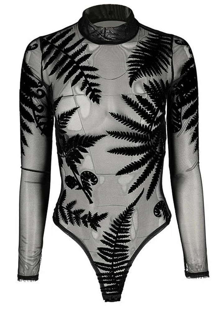 Restyle’s Forest Witch Bodysuit is a long sleeved bodysuit with high neck. The body has a flocked pattern of fern leaves and fastens at the bottom with 2 hooks.