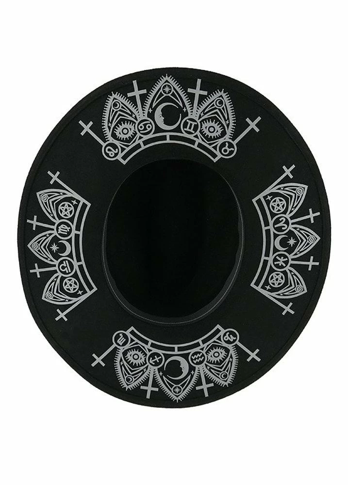Unleash your inner witch with the Fortune Teller Wide Brim Hat by Restyle. This oversized witchy women’s Fedora is made from 100% wool and is fully formed to keep it’s shape perfectly. Underneath, the brim has a print inspired by gothic architecture and astrology with moons and crosses.