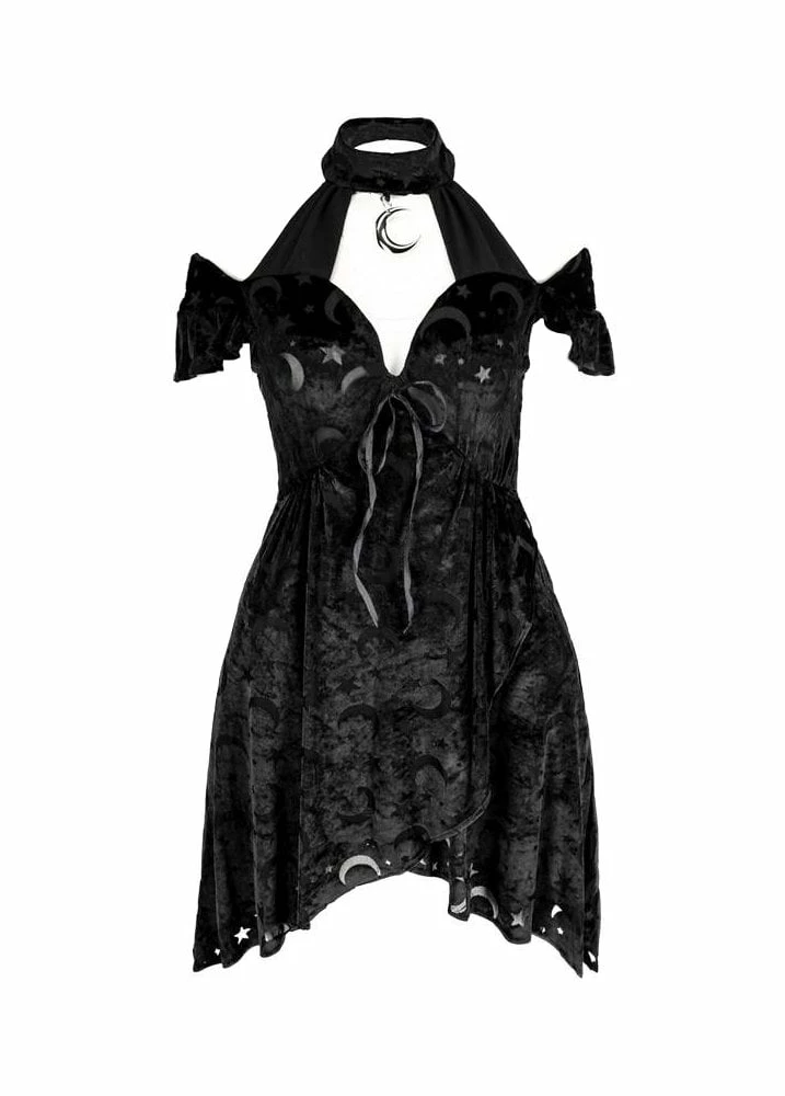 This gothic mini dress by Restyle features an allover crescent moon & stars pattern laser-etched into the soft velvet fabric. Fitted at the waist, it has a sweetheart neckline with mesh inserts and is adorned with a silver tone crescent moon charm.