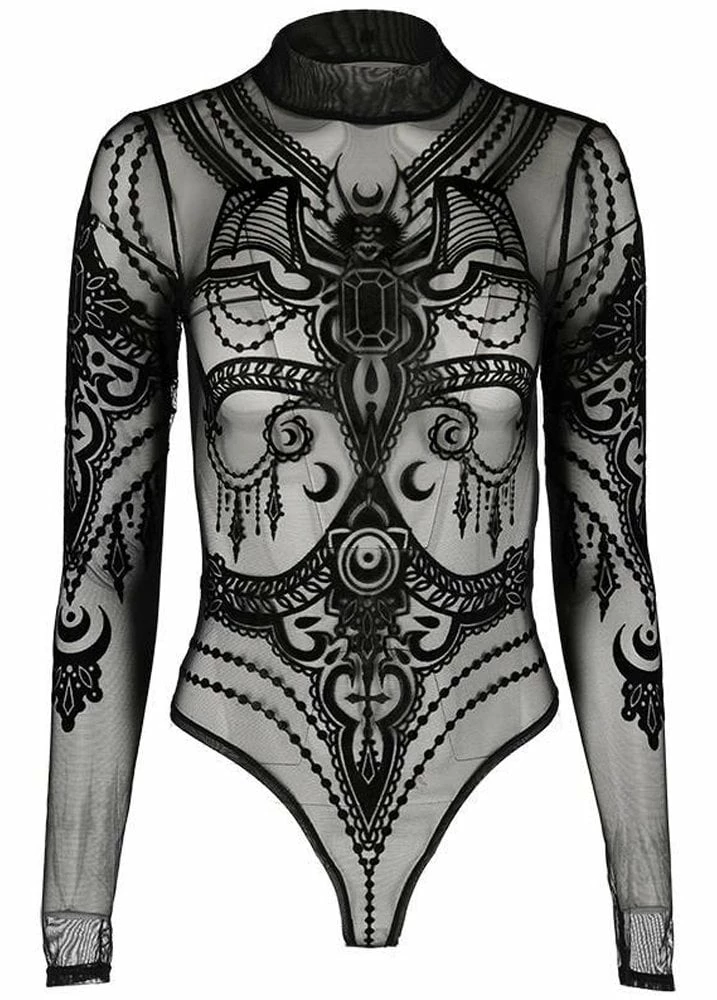 Restyle’s Jewel Bat Mesh Bodysuit is a long sleeved bodysuit with high neck. The body has a flocked pattern with bat centrepiece and fastens at the bottom with 2 hooks.