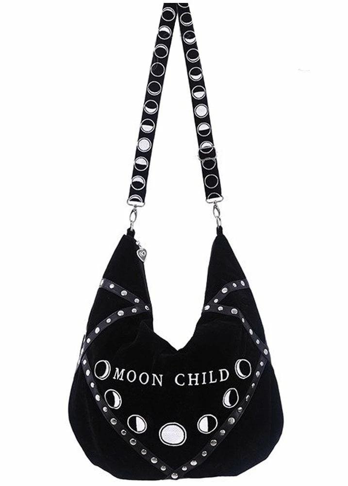 The Moon Child Hobo Bag by Restyle is a black velvet slouched bag with a witchy moon print and slogan. It has further moon details on the removable shoulder strap, and cool studs on straps. Perfect for the modern occult lover!