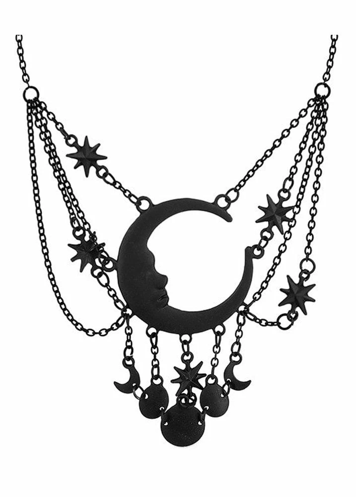 The Sleepless Nights Necklace from Restyle features multiple chains linked with star pendants. There is a crescent moon at the centre and dangling chains with moons.