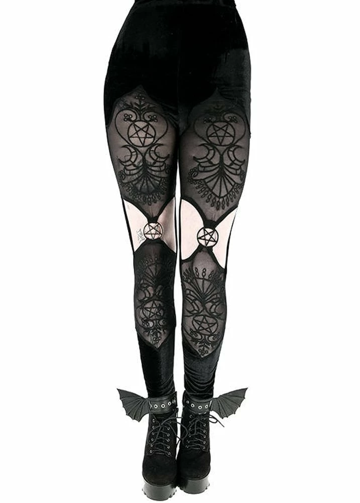 Restyle’s Vesper Velvet Leggings are a gorgeous pair of gothic leggings. The velvet leggings feature mesh fronts with symbols pattern, cut outs at the knees with metal pentagram and a high waist.